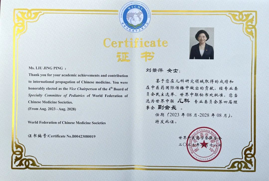 z6mg人生就是博药业集团党委书记、董事长刘景萍当选世界中医药学会联合会儿科专业委员会第四届理事会副会长
